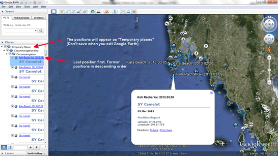 Current and all former positions displayed in Google Earth, open following file in Google Earth: